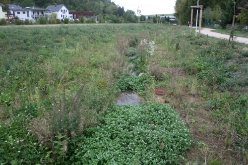 | Abb.: 1 Kleinst Gewässer, ehemals geradlinige Abflussrinne | Abb.: 2 Gewässer Abb.1 sechs Monate nach Renaturierung |