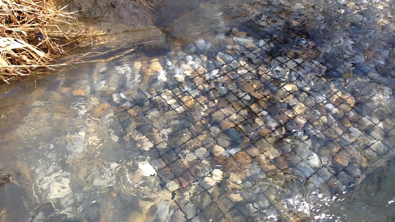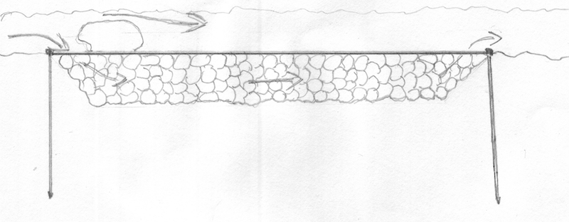 In geeigneten Fließgewässern mit Hochwassergefährdung werden an flachen strömungsintensiven Stellen, die sich auch für natürliche Ablaichvorgänge eignen oder eignen würden, quadratische oder rechteckige Vertiefungen von ca. 20 cm ausgehoben und mit Kieselsteinen, z.B, Klassifizierung 16/32 oder auch etwas größer, angefüllt. Diese Kiesschüttung wird mit einem Stahlgitter (z.B. Maschinengitter), am besten aus Edelstahl oder verzinkt, gesichert, was mit Piloten an den Ecken erfolgt (s. Skizze). Somit können Hochwässer das Material nicht verschleppen und der Brutplatz steht auch für die nachfolgenden Erbrütungsperioden zur Verfügung.