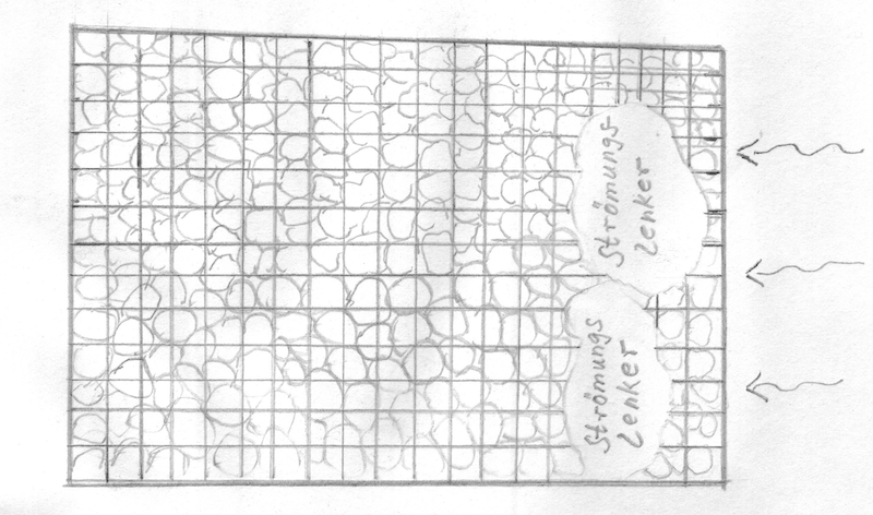 Eine Strömungslenkung nach unten -falls erforderlich- kann durch Auflegen einzelner großer Steine auf die Vergitterung im vorderen Bereich erreicht werden.